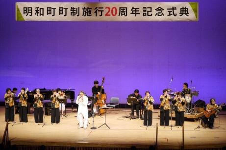 町制施行20周年記念式典の2部で、町内オカリナサークルの「オカリナ奏者宗次郎と共演したい」という夢が叶いました。観客は、オカリナの美しいい音色に聴き入っていました。