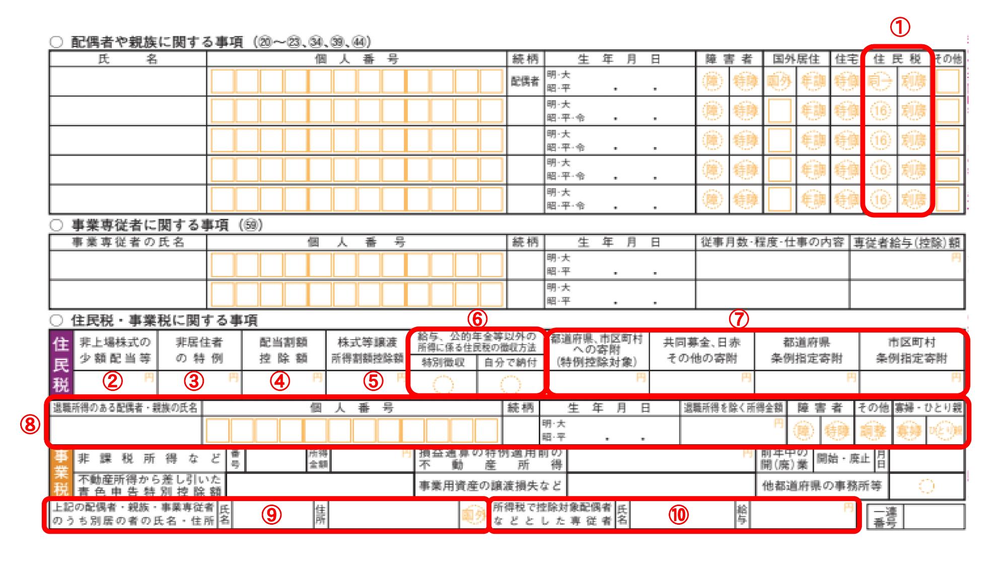 確定申告書第二表には、「住民税に関する事項」という欄があります。この欄は地方税法施行規則により所得税等と取扱いの異なる住民税独自の項目について、申告していただくために設けられています。該当する方は、記載をお願いいたします。