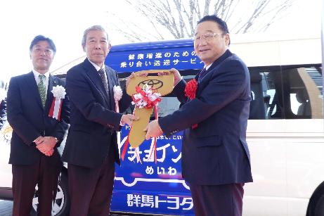 役場でデマンド型バス乗合交通「チョイソコめいわ」の運行開始式が行われました。明和町、町社会福祉協議会、群馬トヨタ自動車株式会社は、2月6日(木曜日)に広域移動支援サービスに関する連携協定を締結しています。